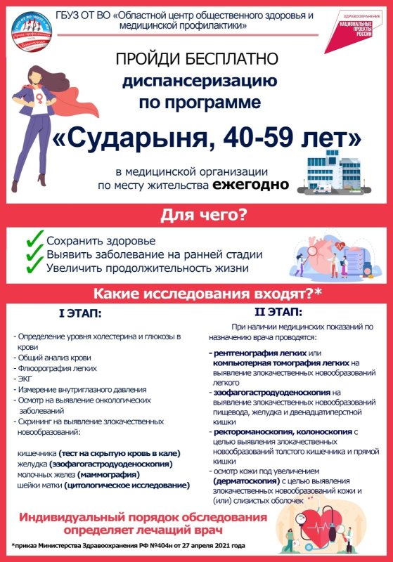 ГБУЗ ОТ ВО «Областной центр общественного здоровья и медицинской профилактики» @ocozmp33 приглашает пройти диспансеризацию.