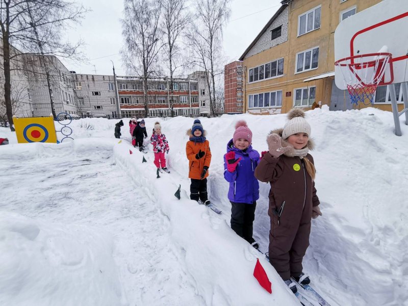 А инструктор по физической культуре, Марина Александровна , подготовила на территории спортивной площадки лыжную трассу.