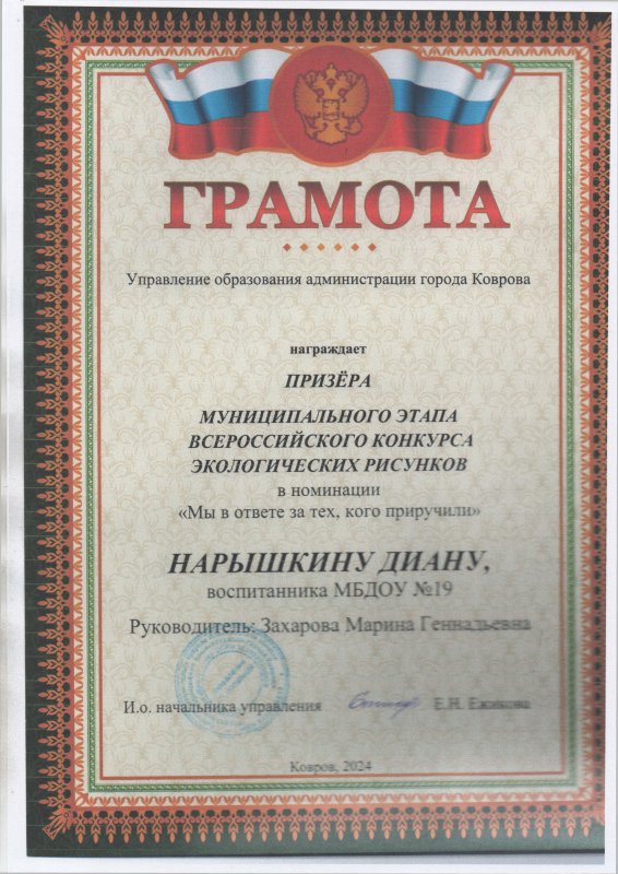 Нарышкина Диана, воспитанница подготовительной к школе группы "Пчелка" - Призер муниципального этапа Всероссийского конкурса экологических рисунков в номинации "Мы в ответе за тех, кого приручили".