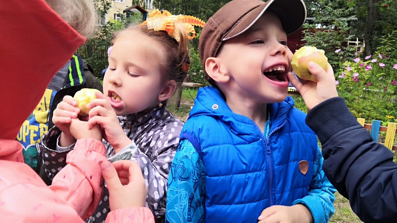 Вот так и у нас получилось! Пчелки подружки трудились, всех медом угостили. А сударыня Яблонька не только наливными яблочками ребят угостила, но и в игры с ребятами поиграла.